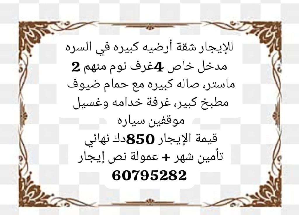 For rent: A ground-floor apartment in Al-Surra with a private entrance - 4 bedrooms including 2 master bedrooms, a large living room with a guest bathroom, a large kitchen, a maid's room and laundry room, two adjacent parking spots - Monthly rent is 850 KD final, non-negotiable - Security deposit of one month's rent + half-month rent as commission.