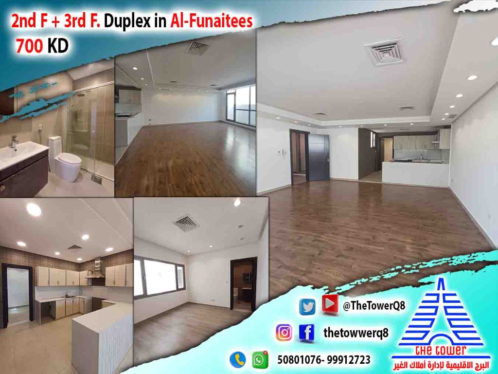 For rent in Fintas, a duplex on the second and third floors with a balcony - super deluxe finishing - 3 bedrooms, all master suites - a living room with a guest bathroom - a maid's room with a bathroom - a separate laundry room - a fully equipped kitchen - shaded parking. Rent is 700 KD. For inquiries.