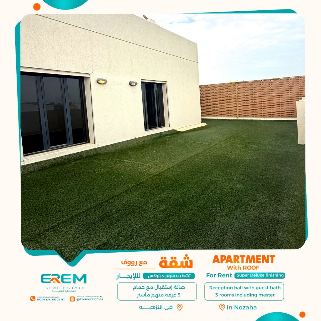 For rent in Al-Nuzha, an apartment with a roof, super deluxe finishing. It consists of a reception hall with a guest bathroom, 3 bedrooms including a master bedroom, a kitchen, a laundry room, a maid's room with a bathroom, and shaded parking. For rent: 800 KD. Code: RA-NZ-9.