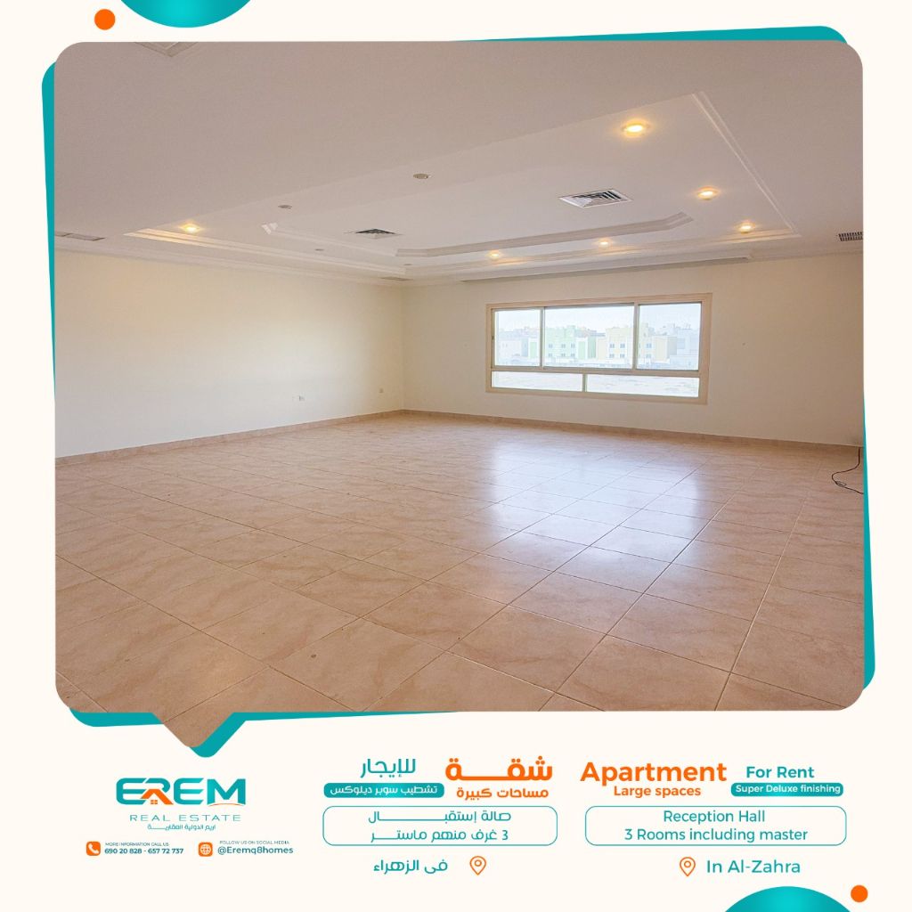 For rent in "Al Zahraa", an apartment with large areas from a 600-meter house, super deluxe finishing. It consists of a hall with a guest bathroom, 3 bedrooms including 1 master bedroom, a large kitchen, a maid's room with a bathroom, a laundry room, shaded parking. Rent: 650 KD. Code: RA - ZH - 72.