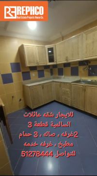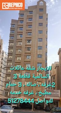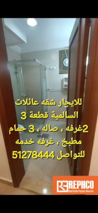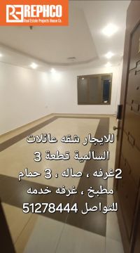 For rent: a family apartment in Salmiya, Block 3. It has 2 bedrooms, a living room, 2 bathrooms, a kitchen, and a maid's room. For contact, no commission.