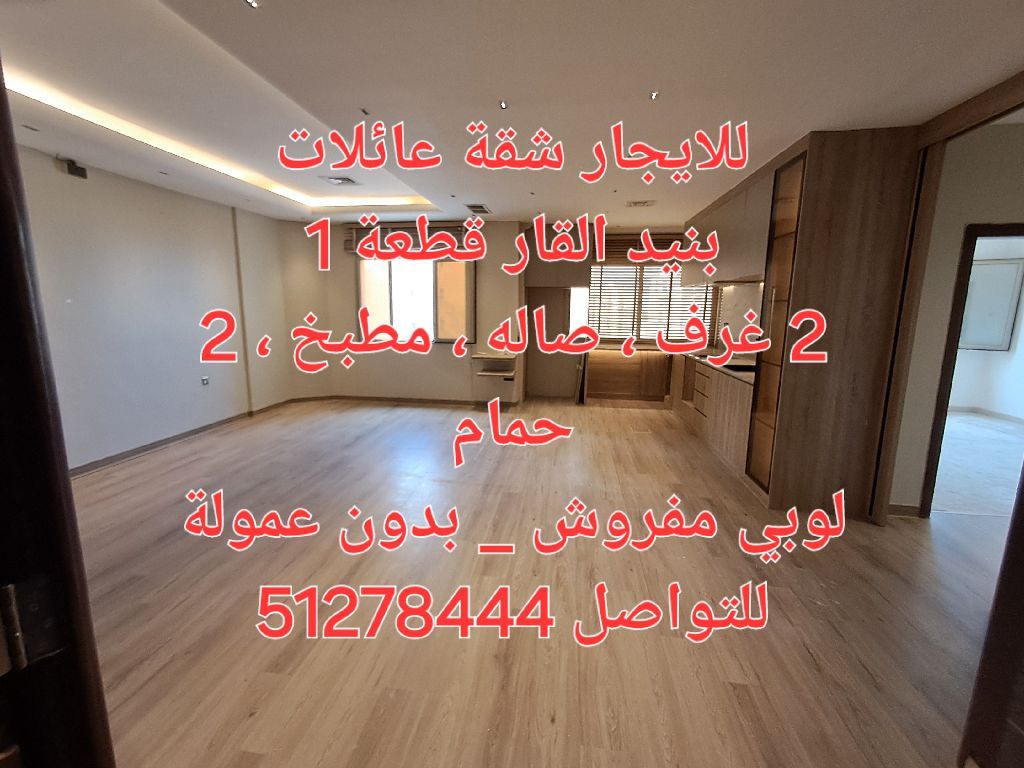For rent a family apartment in Bneid Al Qar, Block 1, containing two bedrooms, a living room, a kitchen, two bathrooms, and a furnished lobby
