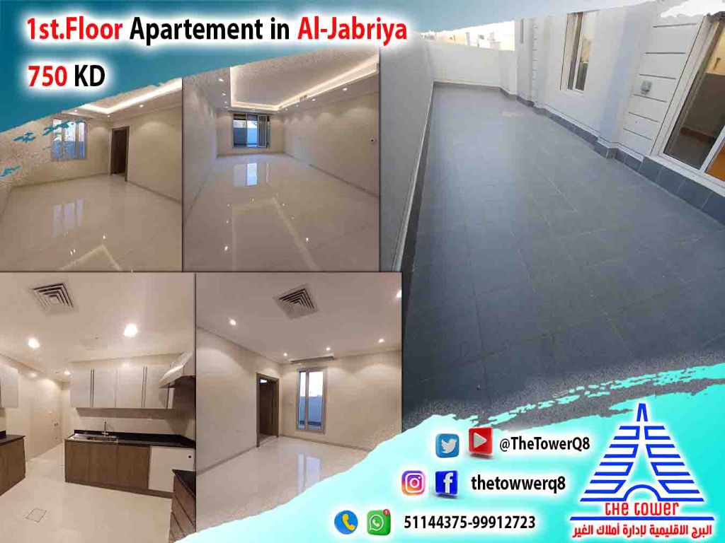 For rent in Jabriya with a free month in January: A first-floor apartment with balconies - very elegant new finishing - first occupant - 4 bedrooms, all master suites - a living room with a guest bathroom - a maid's room with a bathroom - a laundry room - a fully equipped kitchen - shaded parking. Rent is 750 Kuwaiti Dinars. For inquiries.