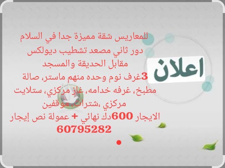A new deluxe finished apartment, master bedroom, two rooms with a bathroom in between, maid's room with a bathroom, large living room, equipped kitchen, central gas shutters, central hood, elevator, shaded parking in Al-Salam, overlooking the public garden, opposite the garden and clinic. Preferably for families or a child's family.