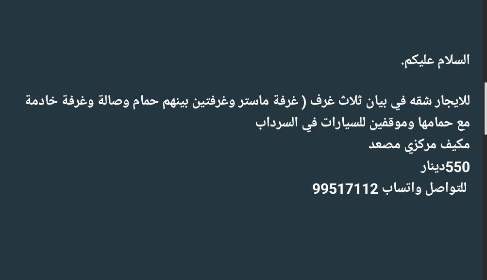 Three rooms (master room and two rooms with a bathroom between them, a hall, a maid's room with its own bathroom, and two parking spaces in the basement, central air conditioning, elevator) for 550 dinars. For contact.