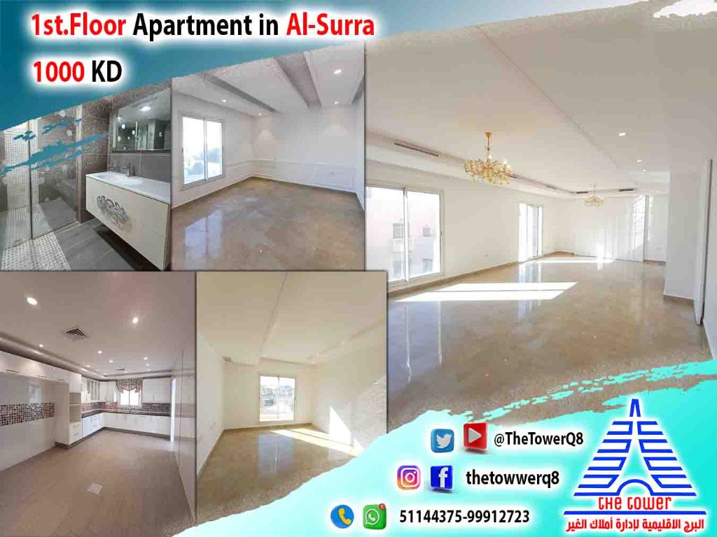 For rent in Al - Surra, first floor with large balconies - part of a front - and - back villa - very high - end finishing - 4 bedrooms (including two master bedrooms - two bedrooms sharing a bathroom) large living room with guest bathroom and laundry area - maid's room with bathroom - separate laundry room - equipped kitchen - covered parking. rent KD1000 for inquiries
