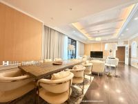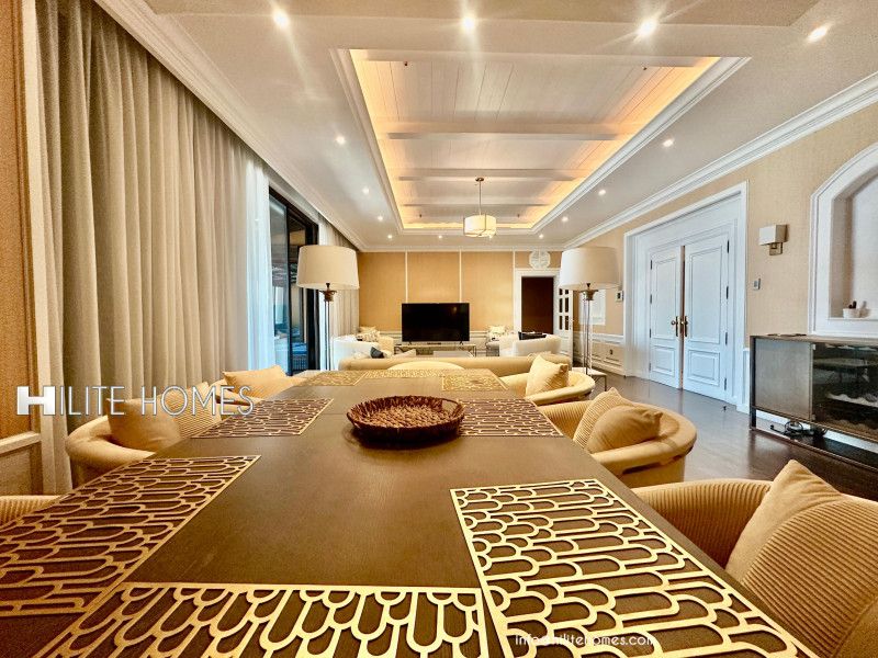 A furnished floor with three bedrooms overlooking the sea, featuring a private swimming pool and a balcony in Salmiya. A full floor with furniture, a spacious living room with a separate dining area, a large kitchen, a separate sitting room, three master bedrooms, a closed kitchen, a laundry room, a maid's room, a private swimming pool with a seating area, and built-in cabinets. The rent is 3000 Kuwaiti dinars.