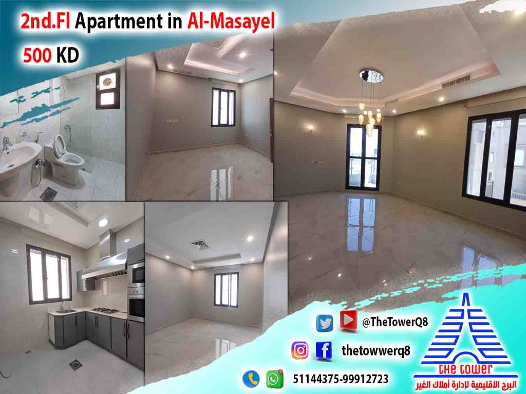 For rent in Al-Masayel, an apartment within a villa, front and back - prime location close to services - easy access and exit - super deluxe finishing - 3 bedrooms (including a master bedroom - two bedrooms share a bathroom) living room with guest bathroom and laundry area - maid's room with bathroom - equipped kitchen - covered parking. Rent 500 KD. For inquiries.