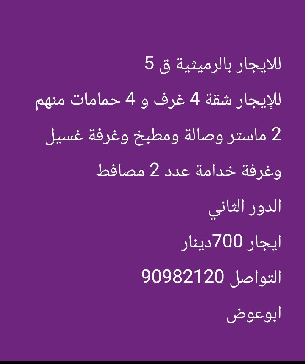 For rent in Al-Rumaithiya, Block 5: A 4-bedroom, 4-bathroom apartment for rent, including 2 master bedrooms, a living room, a kitchen, a laundry room, and 2 maid's rooms. Located on the second floor. Rent is 700 Kuwaiti Dinars. Contact Abu Awad.
