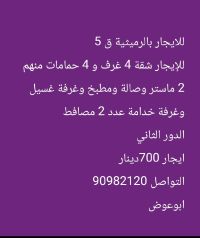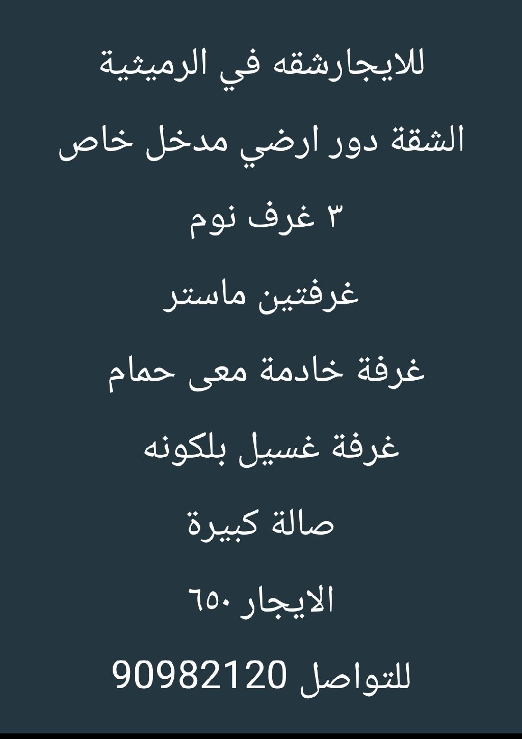For rent: An apartment in Al-Rumaithiya. The apartment is on the ground floor with a private entrance. It has 3 bedrooms, including 2 master bedrooms, a maid's room with its own bathroom, a laundry room, a balcony, and a large living room. The rent is 650. For contact: Abu Awad.
