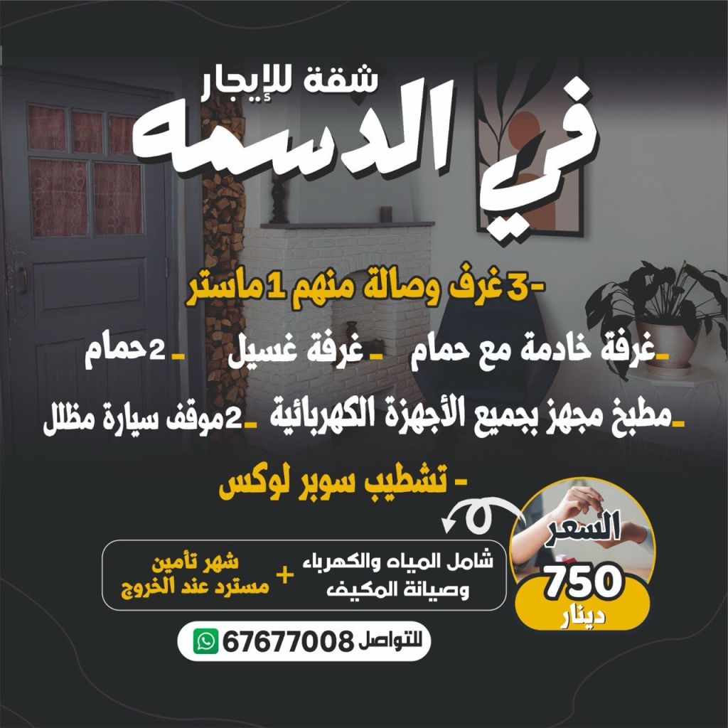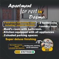 For rent in Dasma, an apartment with super deluxe finishing, suitable for families seeking comfort and luxury, in a prime location in Dasma. 3 spacious bedrooms, a comfortable living room, 1 master bedroom, 2 bathrooms, a maid's room with a bathroom, a laundry room, a fully equipped kitchen with all electrical appliances, 2 shaded parking spaces. Rent is 750 Kuwaiti dinars, including water and electricity, including air conditioning maintenance. One month's security deposit refundable upon departure. For contact.