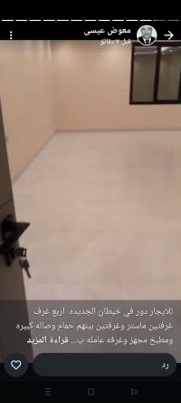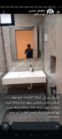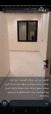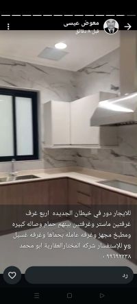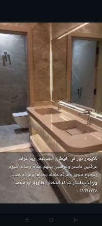For rent: A floor in New Khaitan with four rooms, two master bedrooms, two rooms with a shared bathroom, a large living room, a fully equipped kitchen, a maid's room with its own bathroom, and a laundry room. For inquiries, contact Al-Mukhtar Real Estate Company, Abu Mohammed.