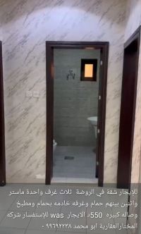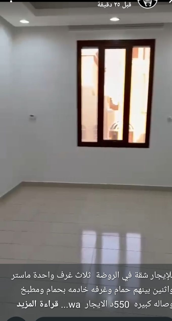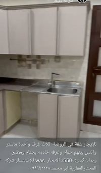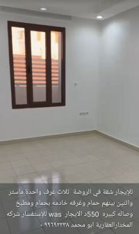 For rent: An apartment in the Al-Rawda area with three bedrooms, one of which is a master bedroom, and two bedrooms sharing a bathroom, plus a maid's room with a bathroom, a kitchen, and a large living room for 550 dinars. For inquiries, contact Al-Mukhtar Real Estate Company, Abu Muhammad.