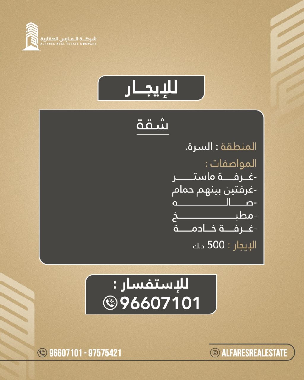 For rent: An apartment in the Al-Surra area with 3 bedrooms, 2 bathrooms, a living room, a kitchen, a maid's room, and parking spaces. Rent: 500 KWD. For inquiries and contact: Al-Fares Real Estate Company - Sale, Purchase, Rent, and Property Management.
