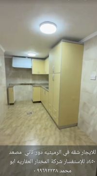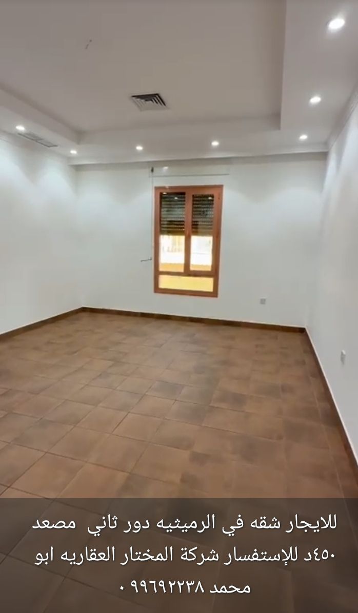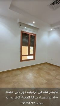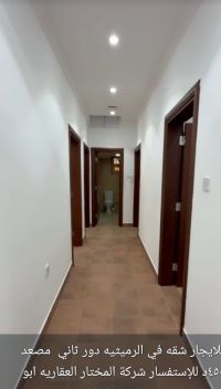 For rent, an apartment in Al-Rumaithiya, second floor, with an elevator. Rent is 450 dinars. For inquiries, contact Al-Mukhtar Real Estate Company, Abu Mohammed.