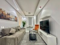 A brand new fully furnished two-bedroom apartment for rent in Salmiya. Its features include a spacious living room with a balcony, two bedrooms (including a master bedroom), a closed kitchen, and access to a modern gym. Rent is 550-750 Kuwaiti dinars. Terms and conditions apply. Real estate agent fees and deposit are applicable.