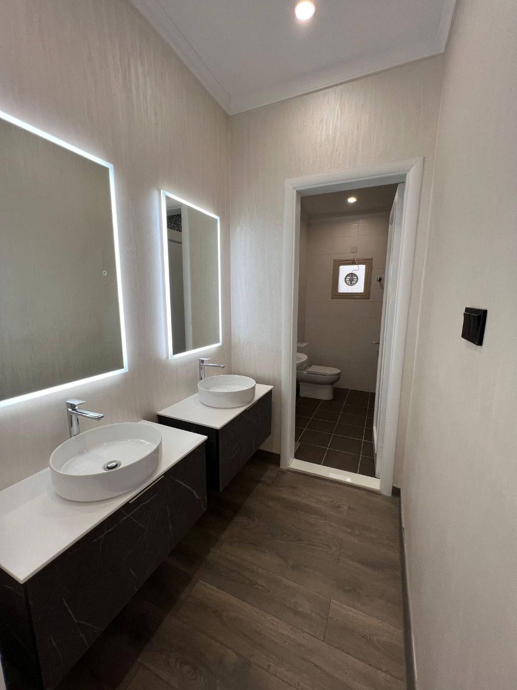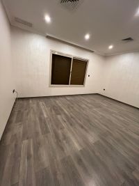 For rent: First floor in Al-Sadeeq, deluxe finishing, Italian paint, and parquet flooring. It consists of 4 bedrooms, including 2 master bedrooms with cabinets, a large living room 12*5, a storage room, a fully equipped kitchen, a maid's room with its own bathroom, a laundry room, and 5 bathrooms. Two shaded parking spots side by side. Rent: 1000 KD. For contact.