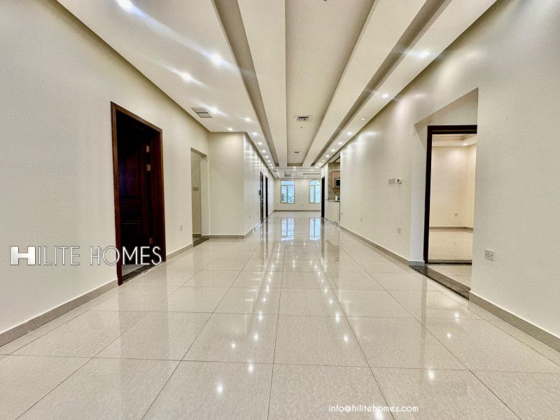 A floor with four bedrooms is available for rent in Abu Fatira. It features a spacious living room, four bedrooms (including two master bedrooms), an open kitchen, a guest bathroom, a balcony, a laundry area, a maid's room with a bathroom, and two parking spaces. The rent is 850 Kuwaiti dinars. Terms and conditions apply. Broker fees and a refundable deposit are applicable.