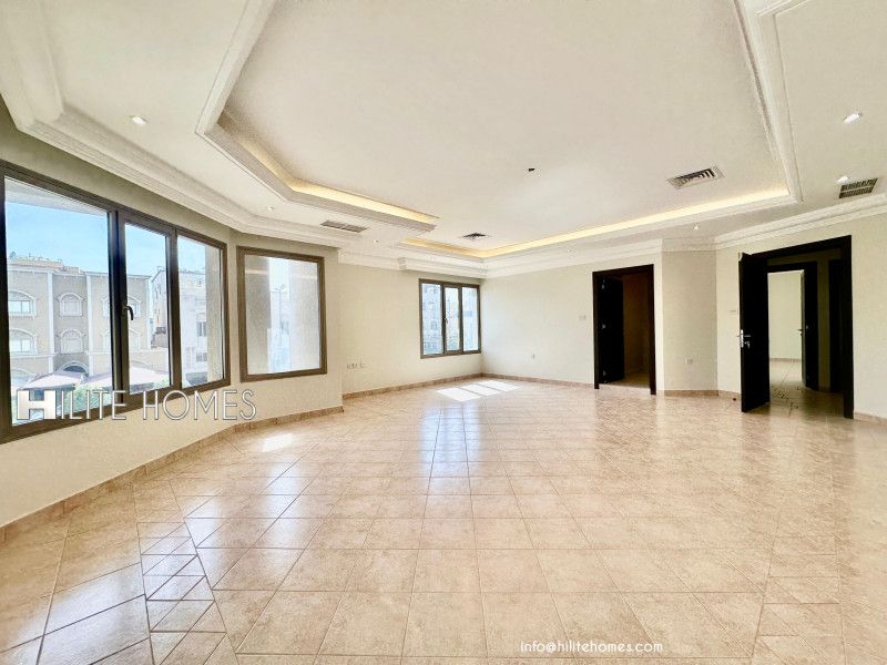 A four-bedroom floor is available for rent in Hateen. It features a spacious living room, a guest toilet, one master bedroom, three bedrooms with two shared bathrooms, a maid's room with a bathroom, a store room, a closed kitchen, and shaded parking. The rent is KD 1000 (negotiable). Terms and conditions apply. Realtor fees and a deposit are applicable.