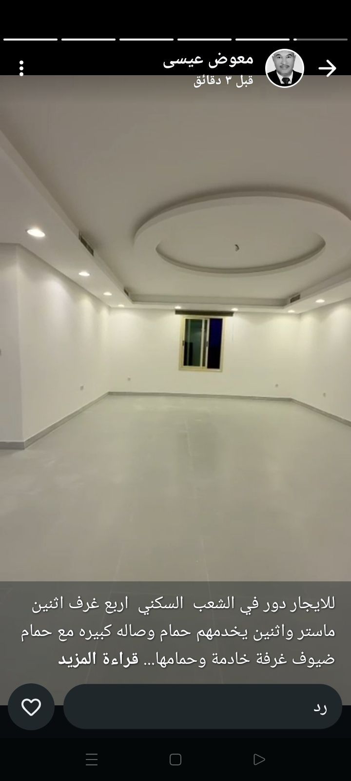 For rent: A floor in a villa in the Al-Sha'ab residential area, plot 4, near services, with easy access. It consists of 4 rooms, including two master bedrooms and two rooms sharing a bathroom, a large living room with a guest bathroom, a large equipped kitchen, and a maid's room with its own bathroom. Two covered parking spots are available. Suitable for a small family. Owner's residence. Rent: 800 dinars. For inquiries: Al-Mukhtar Real Estate Company, Abu Office, Mr. Sayed.