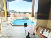 Three-bedroom apartment with a pool in Salmiya. Each floor has one apartment. It includes a living room with a guest bathroom, a kitchen with a storage room, one master bedroom, two regular bedrooms sharing one bathroom, a swimming pool, kids' play area, BBQ area, and a gym. It is close to the shopping mall. Rent is KD800. Call or WhatsApp for viewing.