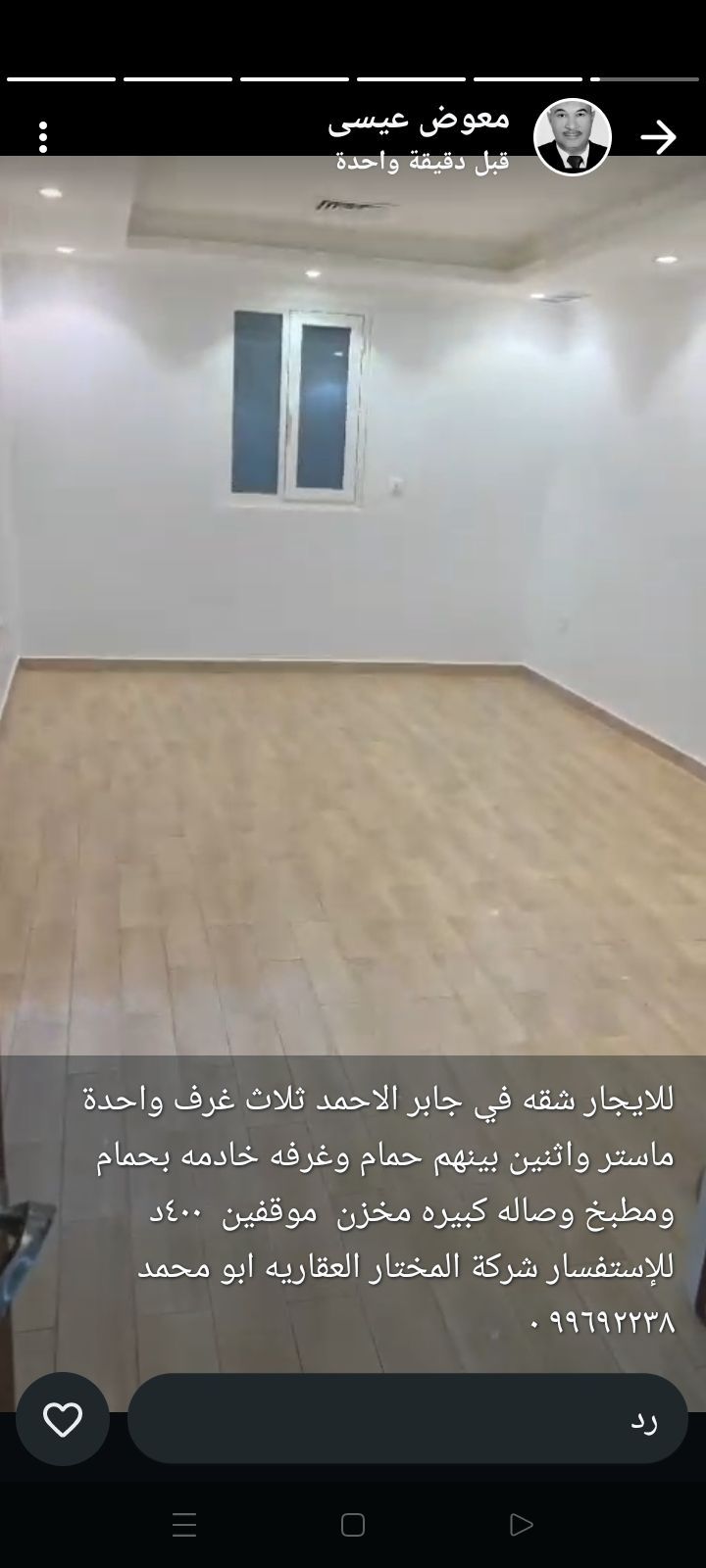 A 3-bedroom apartment with one master bedroom, one maid's room, one small storage room that can be turned into a room, 3 bathrooms, a living room, and 2 parking spaces next to the mosque for rent in Jabir Al-Ahmad. Rent is 400 dinars. For inquiries, contact Al-Mukhtar Real Estate Company, Abu Muhammad.