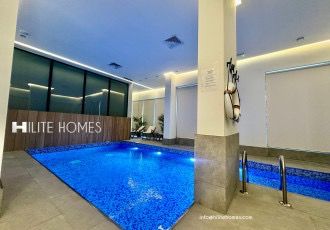 Stylish new one-bedroom semi-furnished apartment in Salmiya with top-tier amenities. Living room balcony, one master bedroom with built-in wardrobe, open equipped kitchen, swimming pool, gymnasium, kids' play area. Weekly one-time cleaning service. Rent KD400 - KD450. KD25 extra for basement parking. Realtor fee applicable.