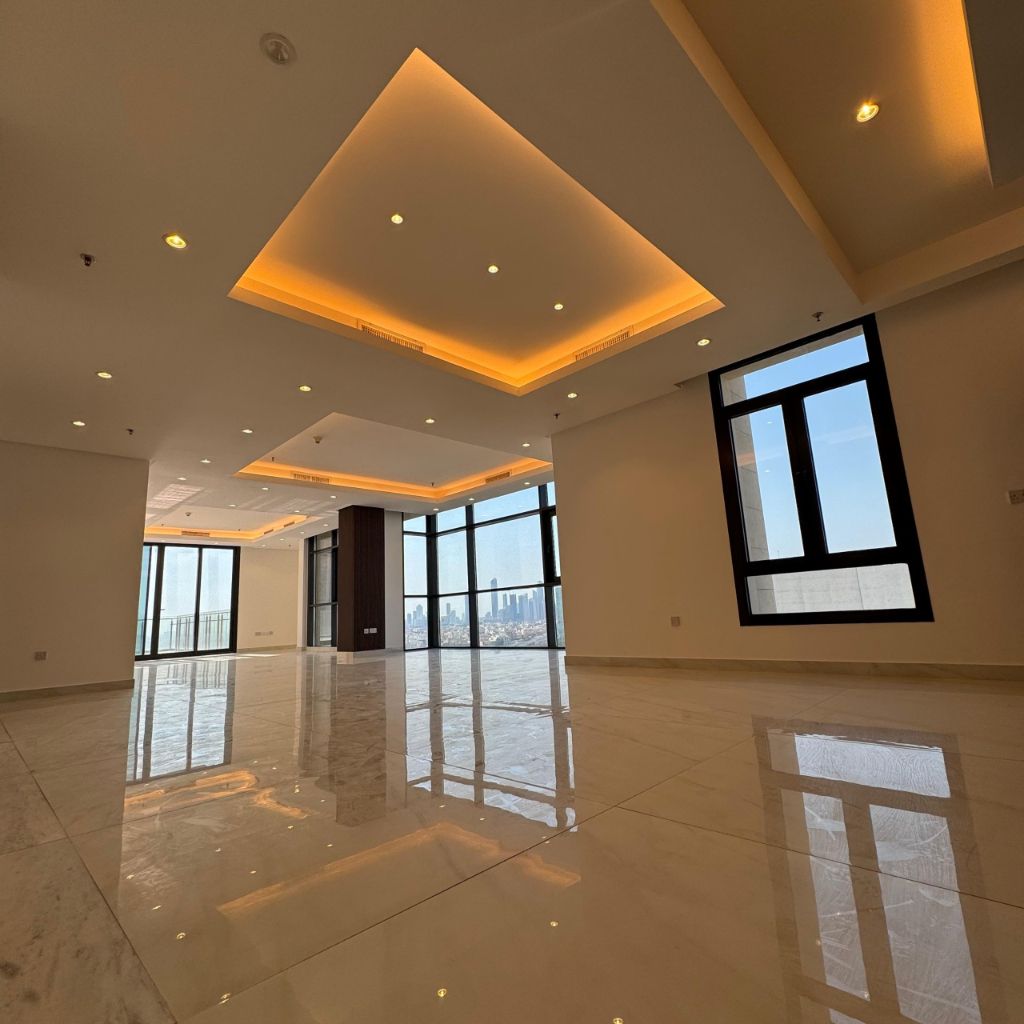 A semi-furnished duplex with a sea view for rent in the Hessa Al-Mubarak suburb, featuring very high-end finishing, a sea view, easy access, consisting of two floors. The first floor includes a living room with a balcony, 4 master bedrooms, a guest bathroom, and a preparation kitchen. The second floor includes a large living room with a large roof, a fully equipped American kitchen and a kitchen with a laundry room, a guest bathroom. Available are a staircase and a private internal elevator for the duplex, and the tower provides a reception lobby, security, cameras, and a swimming pool.