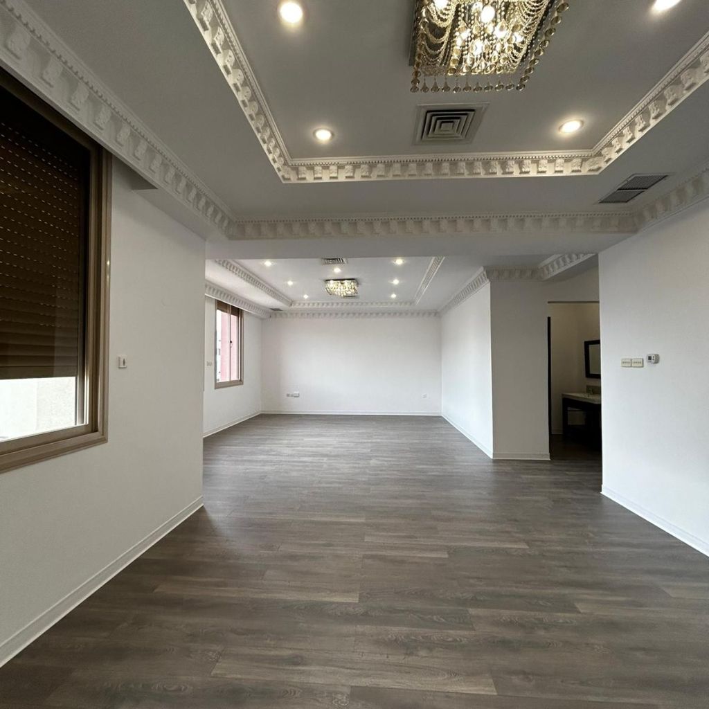 A complete residential floor for rent in Al-Sadeeq with high-end finishing, super deluxe. It consists of 4 bedrooms, 2 of which are master bedrooms, a living room, a kitchen, a total of 5 bathrooms including a guest bathroom, a maid's room with its own bathroom, a laundry room, a storage room, an elevator is available, electric shutters, 4 dedicated parking spaces, includes water, electricity, and air conditioning maintenance. For families only. Rent is 950 Kuwaiti dinars, with a one-month rent deposit plus company commission.