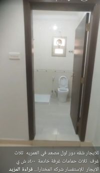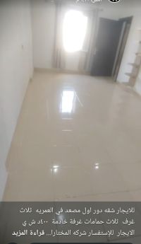 For rent: First-floor apartment with elevator in Al Amiriya, three bedrooms, three bathrooms, maid's room. Rent: 400 Kuwaiti Dinars. For inquiries, contact Al Mukhtar Real Estate Company, Abu Mohammed.