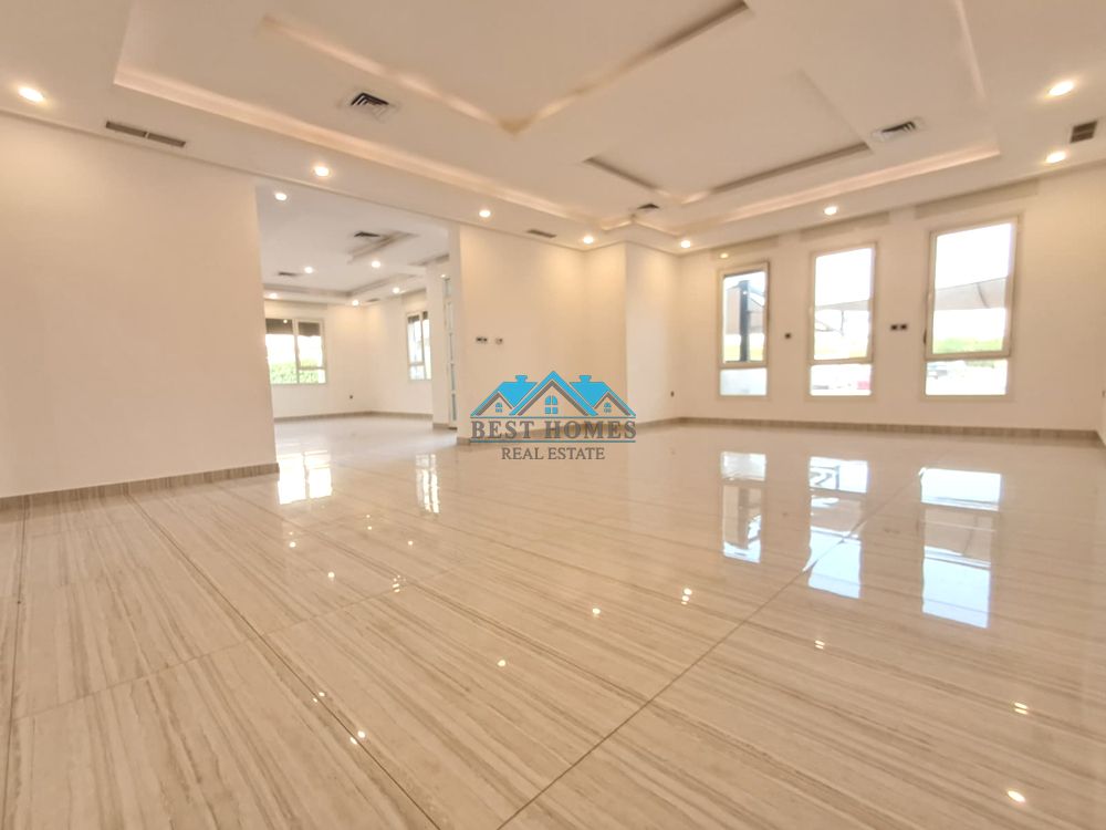 4-bedroom ground floor apartment with private entrance in Abu Fatira. Large living hall with bathroom, 2 master bedrooms, 2 regular bedrooms, kitchen, maid's room, laundry, 3 side entrances, driver's room, and 2 car parking spaces. Rent: KD 1000. Call or WhatsApp for viewing.