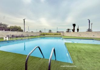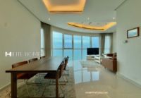 A three-bedroom apartment with a sea view is available for rent in Shaab. It features three bathrooms, a maid's room with a bath, a big kitchen, a living hall with a dining area, a gymnasium, a swimming pool, parking, security, and a garden. The rent ranges from KD 1000 to 1800, with options for semi-furnished and fully furnished units. A realtor fee is applicable.