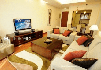 Modern, fully furnished, and serviced one-bedroom apartment for rent in Jabriya. It features a big living hall, dining area, and an equipped open-plan kitchen. Facilities include a gymnasium, swimming pool, and satellite internet. Rent is KD550. Realtor fee applicable.