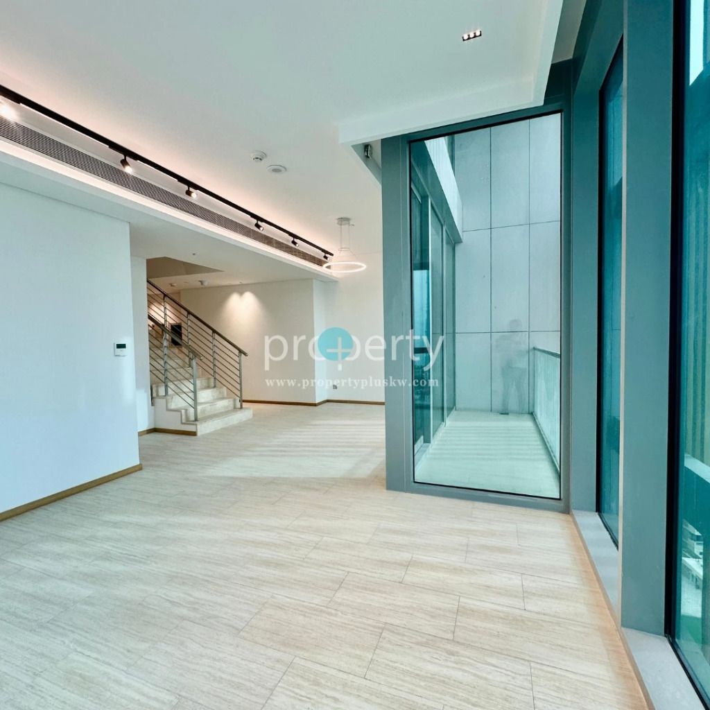 New sea view duplex in Daiya with three bedrooms, equipped kitchen, maid's room, balcony, pool, gym, parking, rent KD 1200. License Number 2013/466, Commercial Registration Number 345997, Property Plus Real Estate Company, a limited liability company.