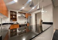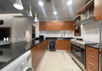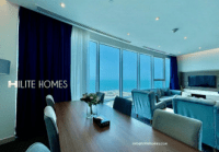 Luxury 2-bedroom and 1-bedroom sea view apartments for rent in Salmiya. Features include a living room with dining area, open kitchen, maid's room with bathroom, guest toilet, two bedrooms (one master), two bathrooms, shared swimming pool and gym, parking, and 24-hour security. One-bedroom units are fully furnished starting at KD750, and two-bedroom units are fully furnished from KD1200 to KD1450. This luxury accommodation is located in the Kuwait City district of Kuwait City and contains 38 units.