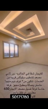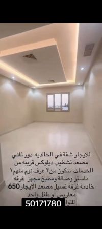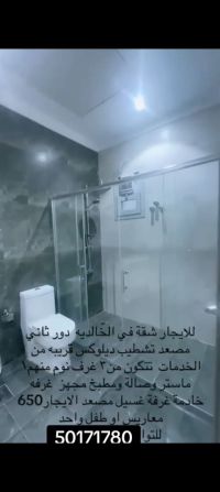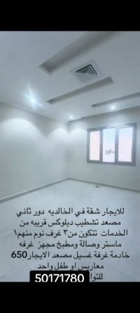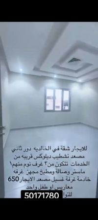 Hurry up! For rent, a new apartment in Al Khalidiya, VIP finishing, second floor with elevator. It consists of 3 bedrooms, including 1 master and 2 with a shared bathroom, plus a large living room, curtains for the entire apartment, a fully equipped kitchen, a maid's room with its own bathroom, and two shaded parking spots side by side. Rent is 650 KD for married couples or a child. For contact, a video is available.