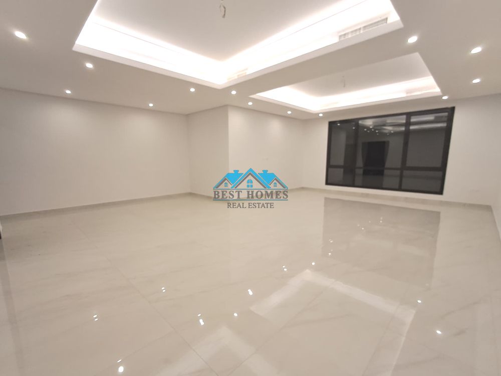 A modern floor with 4 bedrooms in Abu Fatira. Large living room with bathroom, kitchen, two master bedrooms, two regular bedrooms, maid's room, laundry room, and two parking spaces. Rent is 900 Kuwaiti dinars. Second floor, Abu Fatira.