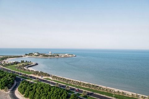 An apartment overlooking the sea in Salmiya, with 3 bedrooms, 2.5 bathrooms, a living room with an open kitchen, a maid's room with a shower, a swimming pool, and parking for two cars. Prices start from 750 Kuwaiti dinars per month, depending on the floor. Please contact Horizon Q8 Real Estate Company. Insurance and real estate fees equivalent to half a month's rent apply.