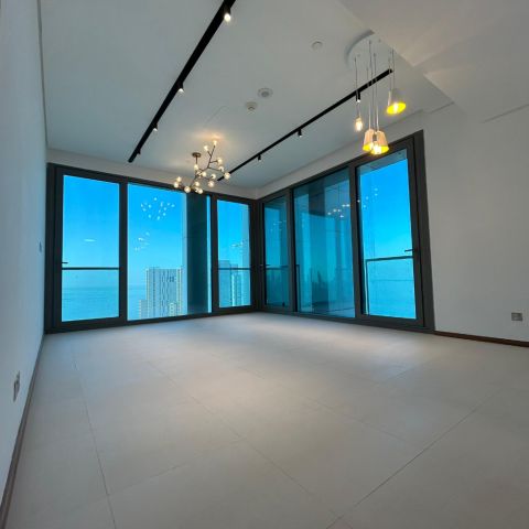 Penthouse with sea view, first occupant, for rent in Al - Mubarak area, prime location, high - end finishing, area 200 SQM. First floor includes a private pool, living room with guest bathroom, master bedroom, equipped American kitchen, maid's room with its own bathroom. Second floor includes a master bedroom, 2 bedrooms, walk - in closet with bathroom, 3 balconies available, 2 storage rooms, gym available