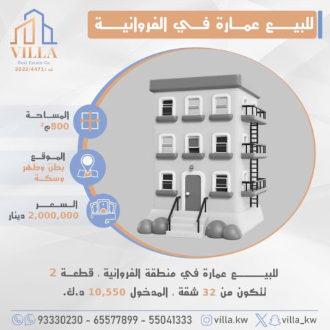 للبيع: عمارة في منطقة الفروانية، قطعة 2، مساحتها 800 متر مربع. الموقع بطن وظهر وسكة. تتكون من 32 شقة، المدخول 10550 دينار كويتي. السعر 2000000 دينار كويتي. للاستفسار، اتصل بالرقم 1، الرقم 2، الرقم 3.
