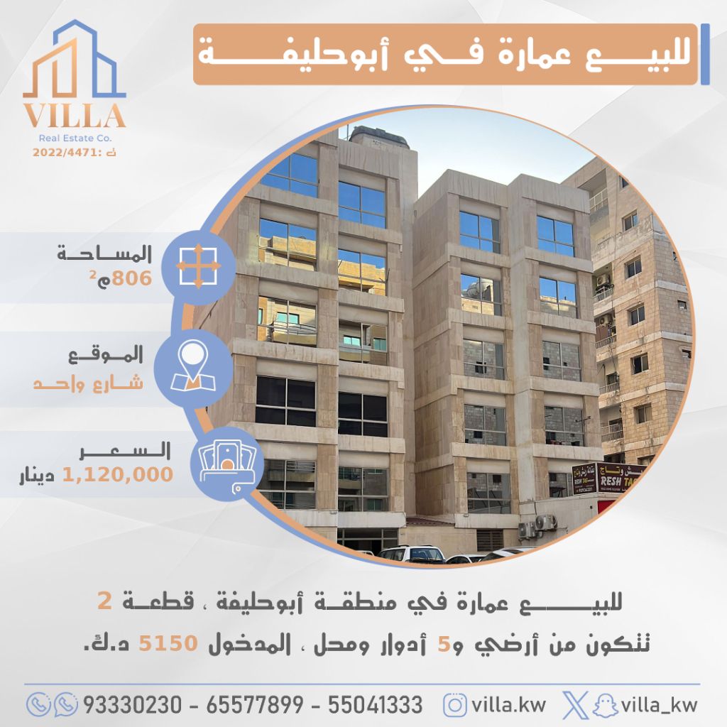 للبيع عمارة في منطقة أبو حليفة، قطعة 2، المساحة 806 متر مربع، الموقع شارع واحد، تتكون من أرضي و5 أدوار ومحل، المدخول 5150 دينار كويتي، السعر 1,120,000 دينار كويتي، للاستفسار نقال 1 نقال 2 نقال 3