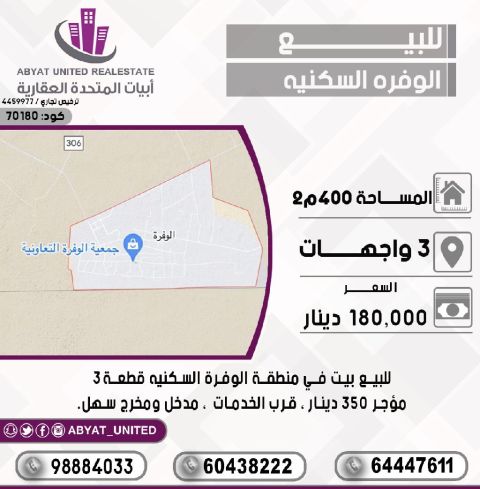 للبيع: بناية في منطقة الشعيب البحري، مساحتها 1000 متر مربع، موقع زاوية مقابل سكة عريضة على البحر. إنه بيت قديم هدام، بشرط الإخلاء خلال 3 أشهر. السعر: 3 ملايين. البيع بإذن الله. البيت ورثة ومتفقين.