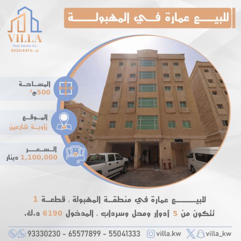 For sale: a building in the Al-Mahboula area, Plot 1, area 500 sqm, corner location on two streets, consisting of 5 floors, a shop, and a basement. Monthly income: 6,190 Kuwaiti dinars. Price: 1,100,000 Kuwaiti dinars. For inquiries, call: Mobile 1, Mobile 2, Mobile 3.