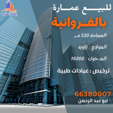 For sale: a building in Farwaniya specialized for medical clinics, area 520 square meters, corner location, monthly income 15000, easy entrance and exit.