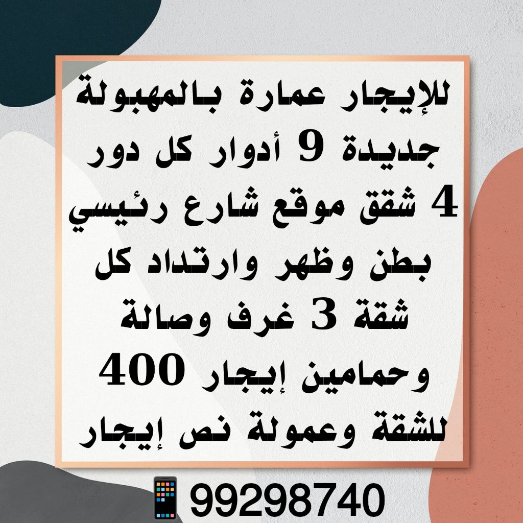 للإيجار: عمارة جديدة في المهبولة مكونة من 9 أدوار. كل دور يحتوي على 4 شقق. موقعها على شارع رئيسي مع واجهة أمامية وخلفية وارتداد. كل شقة تحتوي على 3 غرف وغرفة معيشة وحمامين. الإيجار 400 دينار للشقة، مع عمولة تساوي نصف الإيجار.