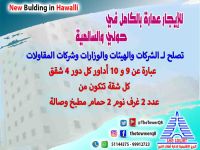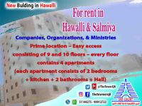 For rent: buildings in Hawalli and Salmiya for companies, organizations, and ministries. Entire building - prime location - easy access - consisting of 9 to 10 floors, each floor contains 4 apartments (each apartment consists of two bedrooms, a kitchen, two bathrooms, and a living room) with large areas. For inquiries.