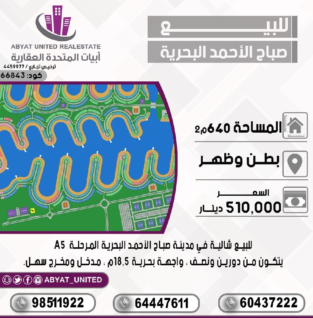 For sale: A chalet in Sabah Al-Ahmad Sea City, Phase A5, front and back location. Area 640 m², consisting of two and a half floors, with a sea frontage of 18.5 m, easy entrance and exit. For inquiries, Mobile 1, Mobile 2, Mobile 3. Price 510,000 Kuwaiti Dinars. Code 66843.