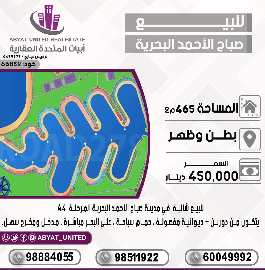 For sale: A chalet in Sabah Al-Ahmad Sea City, Phase A4, front and back location, area 465 m2, consisting of two floors, separate diwaniya, swimming pool, directly on the sea, easy access. For inquiries, mobile 1, mobile 2, mobile 3. Price 450,000 dinars. Code 66882.