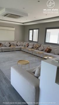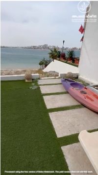 For rent: A chalet in Al Khiran Sea, first row on the head of the creek. It consists of one floor with 8 master bedrooms, a sea-view living room, and an external guard room. Fully furnished. Rent: 1000 Kuwaiti Dinars. New code: 5599. For contact - Commercial license number / 1234 - 2013.