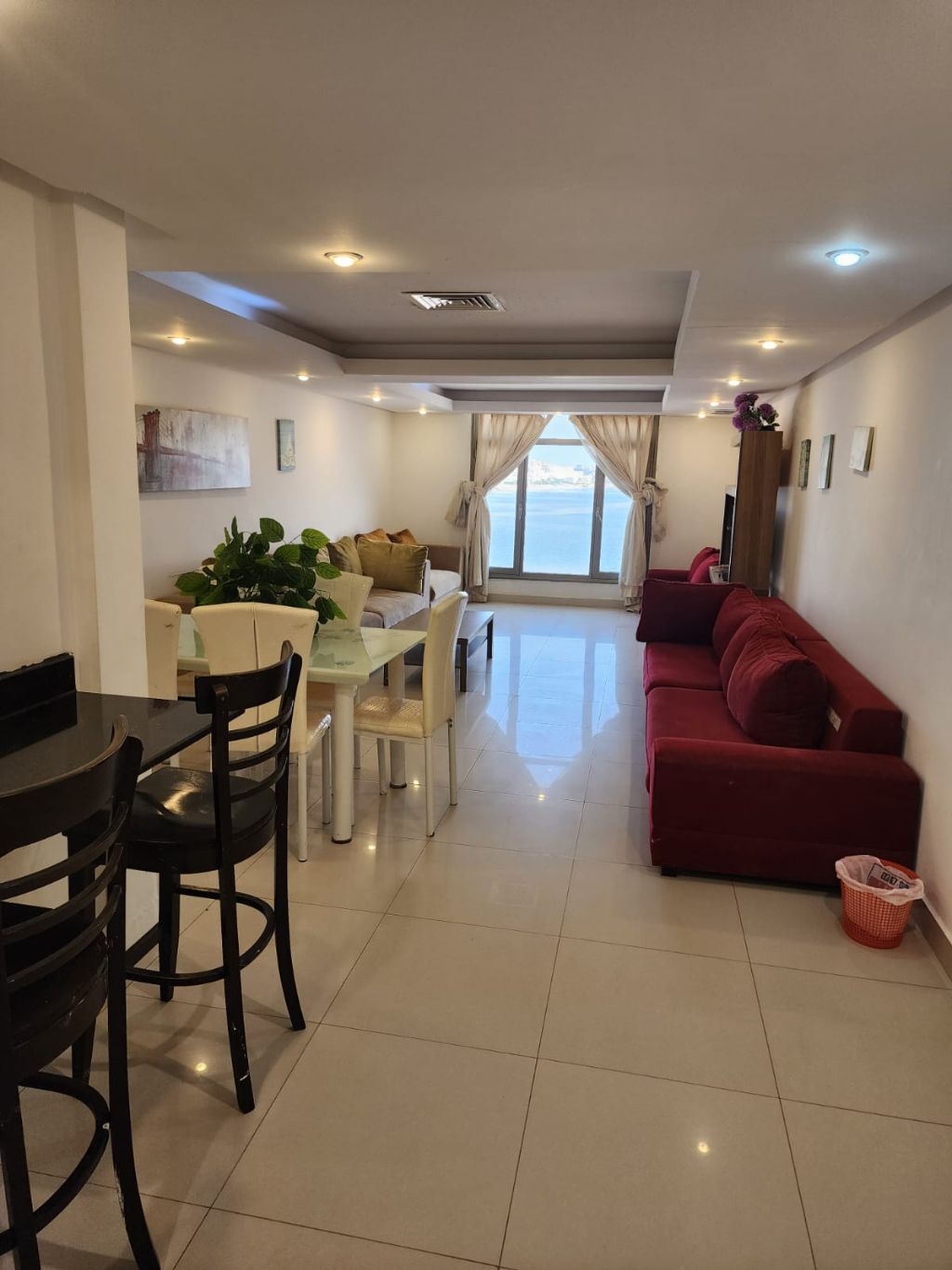 For rent: A chalet in Al-Khiran on the creek for families. An apartment on the first floor containing two bedrooms, a living room, a balcony, a maid's room, three bathrooms, a kitchen, and an elevator available from Thursday to Saturday for 80 dinars.